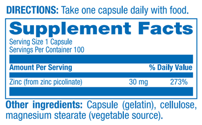 Provides a full 30 mg (200% RDI) of highly digestible chelated zinc picolinate designed for maximum delivery of trace elements through the digestive tract into human plasma.